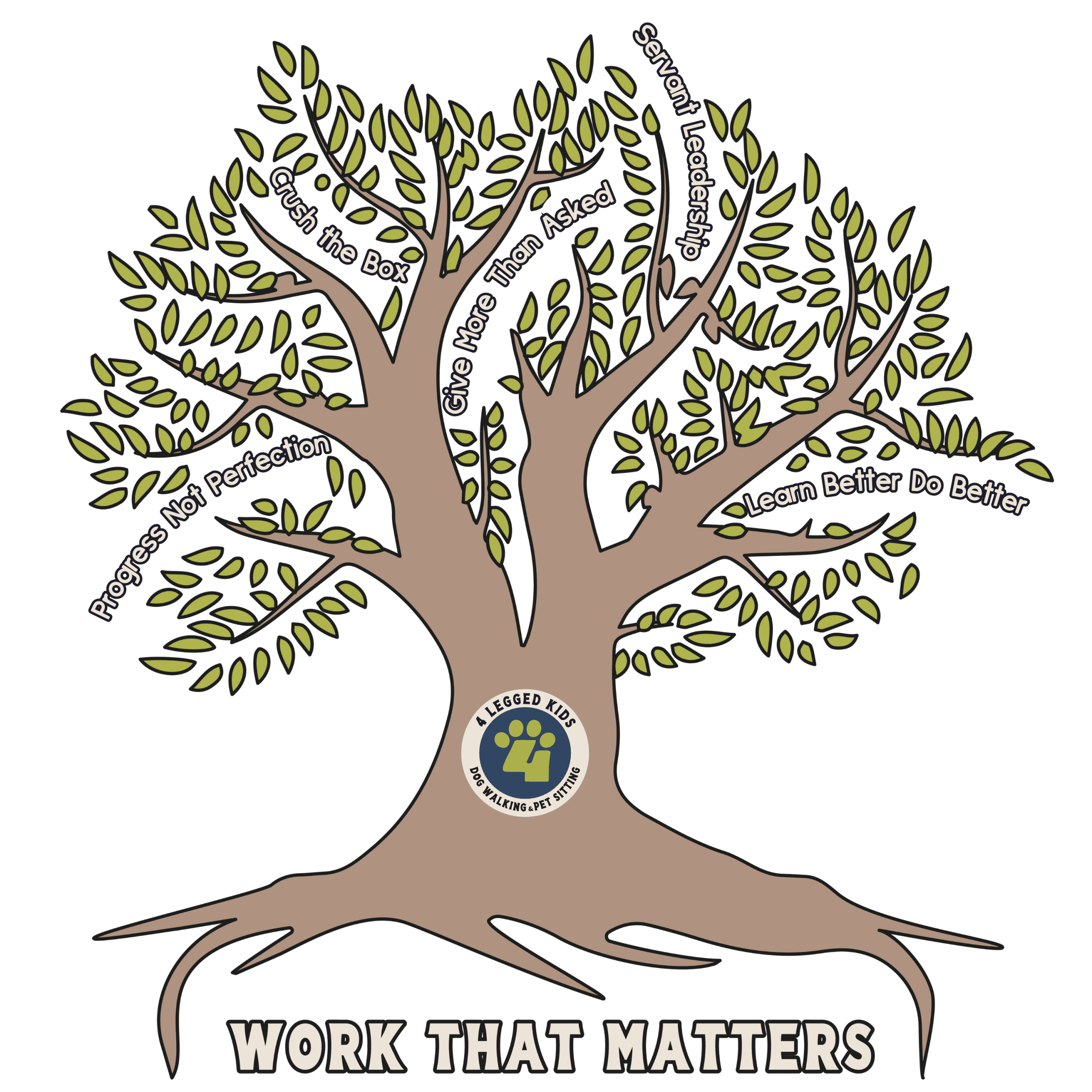The roots of our tree makes us strong. You can see that we do WORK THAT MATTERS. We don’t just play with puppies and kitties all day. It is WAY more than that. We care for some of the most precious things in your life. We are YOU when you can’t be there.